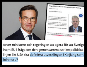 Moderaternas dåvarande utrikespolitiska talesperson Hans Wallmark krävde dock 2021 att S-regeringen skulle driva på inom EU för att få Kinas behandling av uigurerna i Xianjiang att definieras som folkmord.