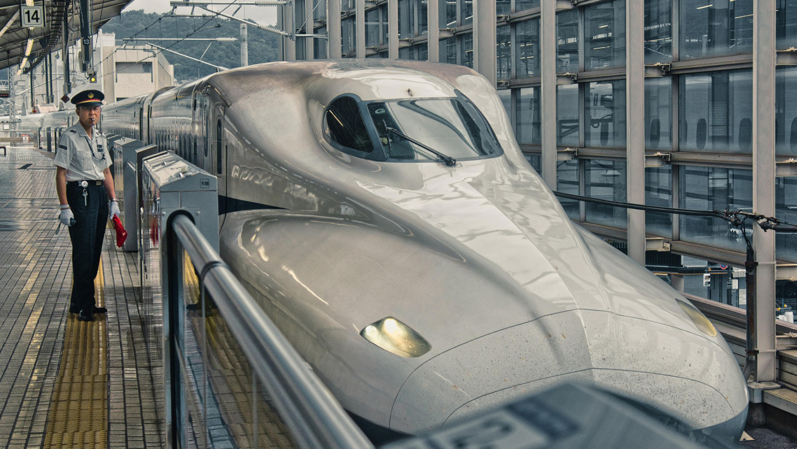 Japanskt snabbtåg vid station.