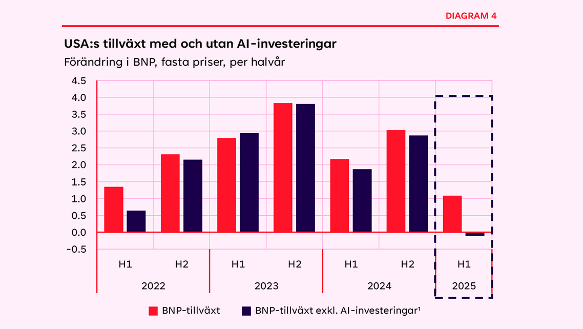AI-investeringar är definierade som investeringar i it-utrustning och mjukvara. Källa: Bureau of Labour Statistics of Economic Analysis. Ur “Jobbkris trots återhämtning”.